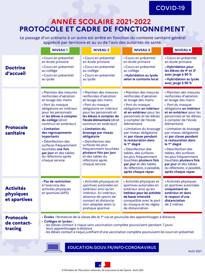 Read MoreMesdames, Messieurs, Le protocole sanitaire qui sera appliqué à la rentrée correspond au niveau 2 des protocoles publiés